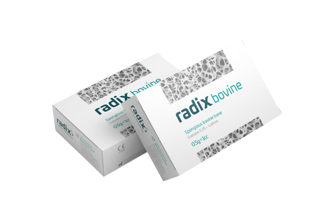 radix bovine Spongious bovine bone is available in granules with a particle size between 0.25-1.68 mm: it is presented in gamma radiation sterile vials of 0.5g and 1.0g.